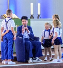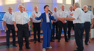 „Die blaue Frau“- ein Abend mit Petra Nova – stand am 28. September 2025 um 18 Uhr auf unserem Programm. Ca. 140 Besucher und Besucherinnen wollten die Frau erleben, die sie eigentlich als Journalistin des Kölner Stadtanzei-gers kannten. Schon bei der Be-grüßung und Ankündigung „der blau-en Frau“ durch Pfarrer Greve gab es langanhaltenden Applaus und am Ende dann Standing Ovations. Es war ein beeindruckendes Programm mit Überraschungsgästen.